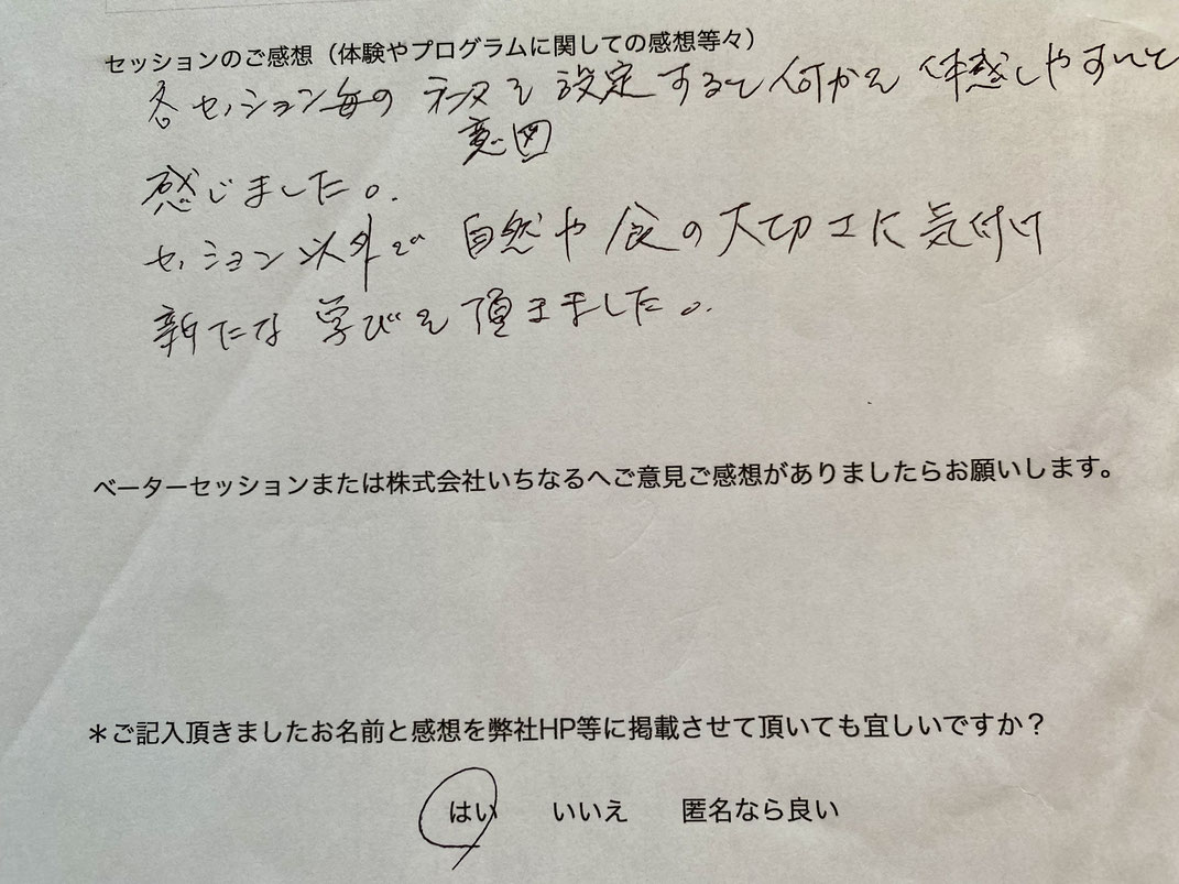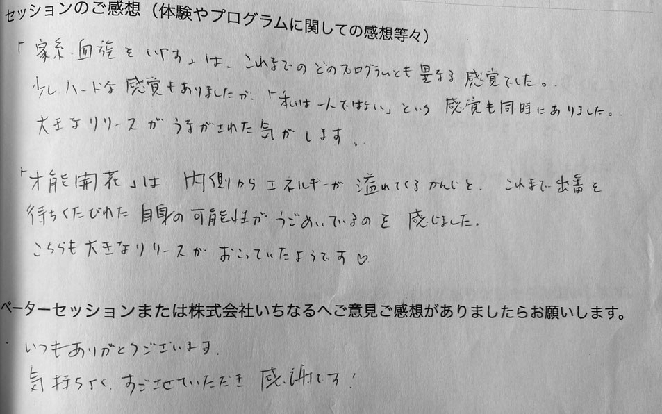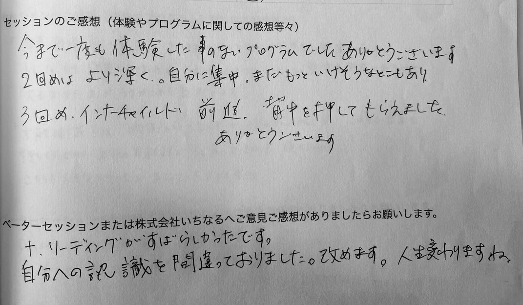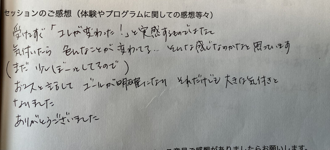 フィードバックでは、自分が感じていたことの言語化により、あらためて明確化されたことと、本当の自分の姿を伝えられ、〝そういえば子供の時ってそういう感性?感覚があったよなー〝と思い出されました。あとは行動化。