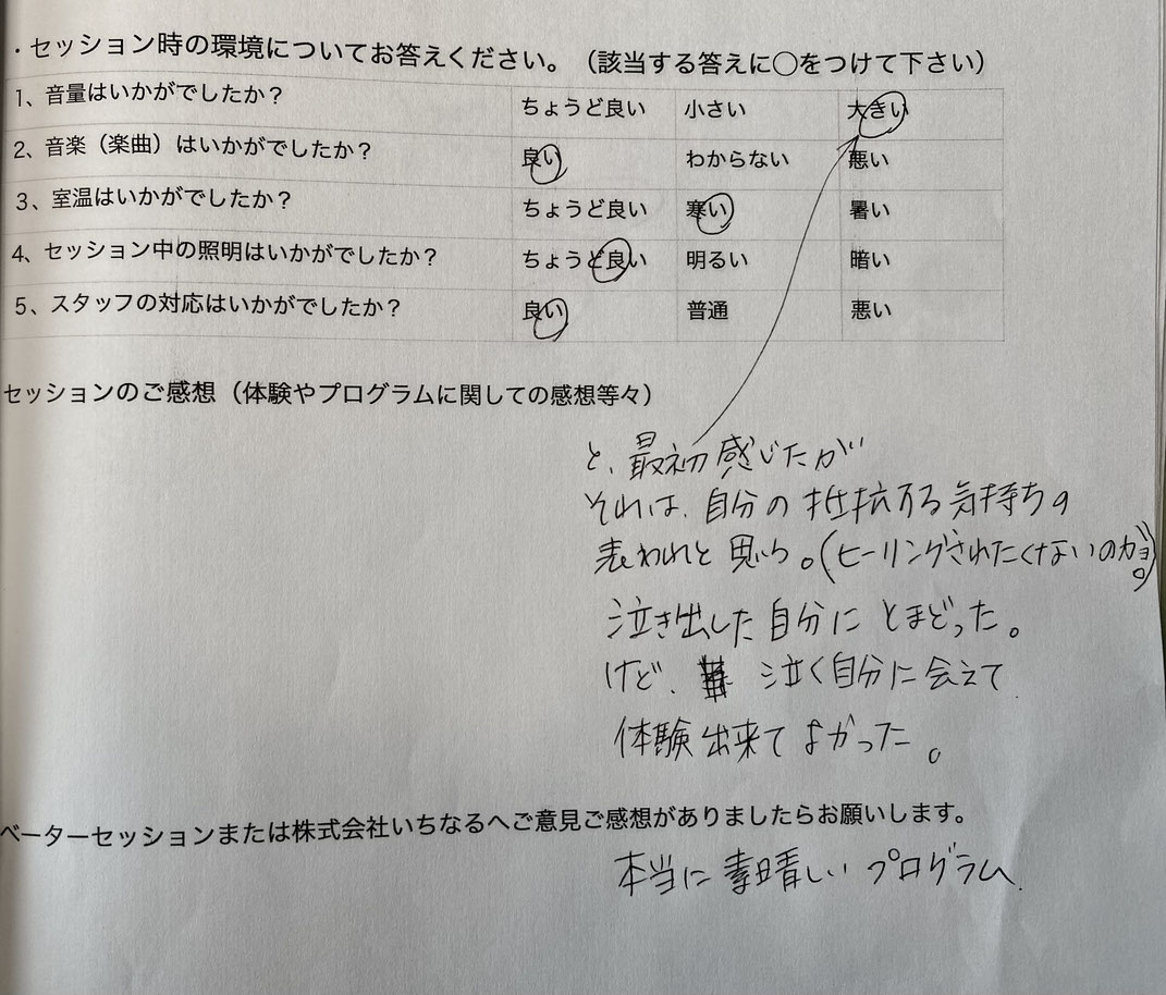 同じ音楽で2回セッションを受けると1回1回別の体験ができて良かったです。体重が2kg位減った感じです。終わった後の爽快感が今回は大きかったです。