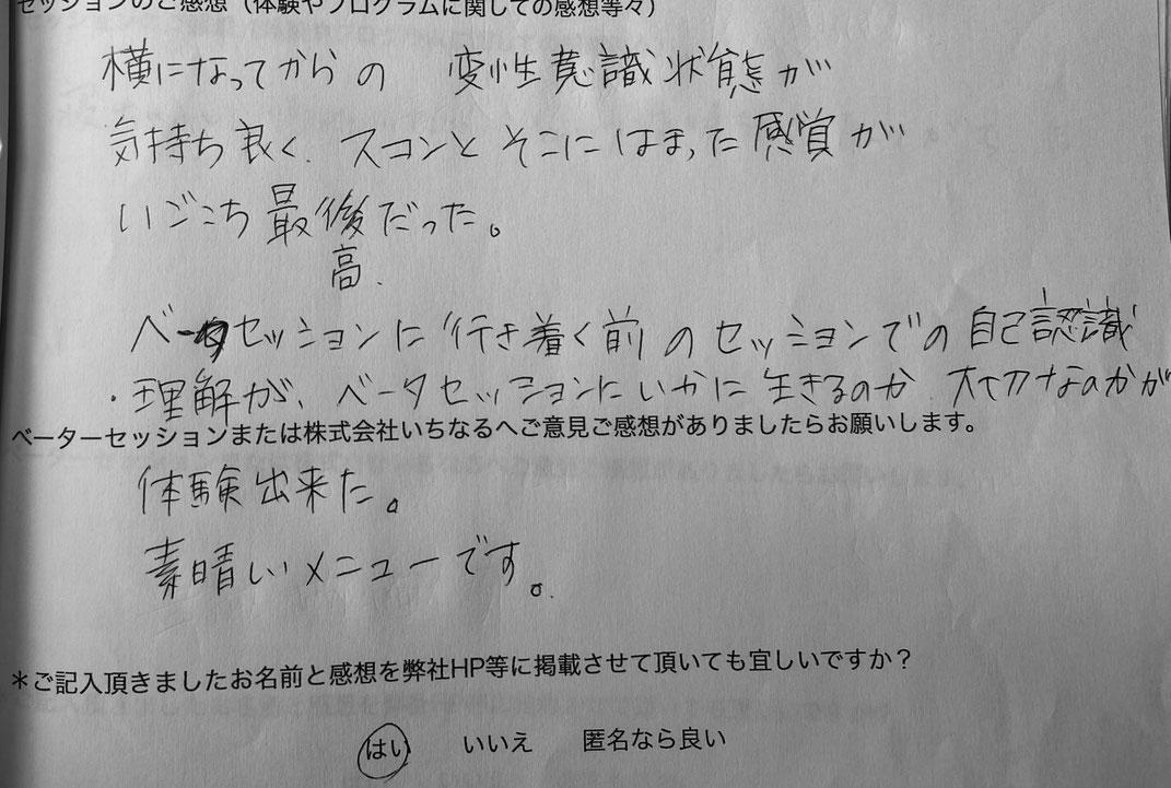 ベーターを始める前のカウンセリングで気づかされ、意図設定ができベーターセッションに挑むことができました。なるちゃんのカウンセリングありがたい。